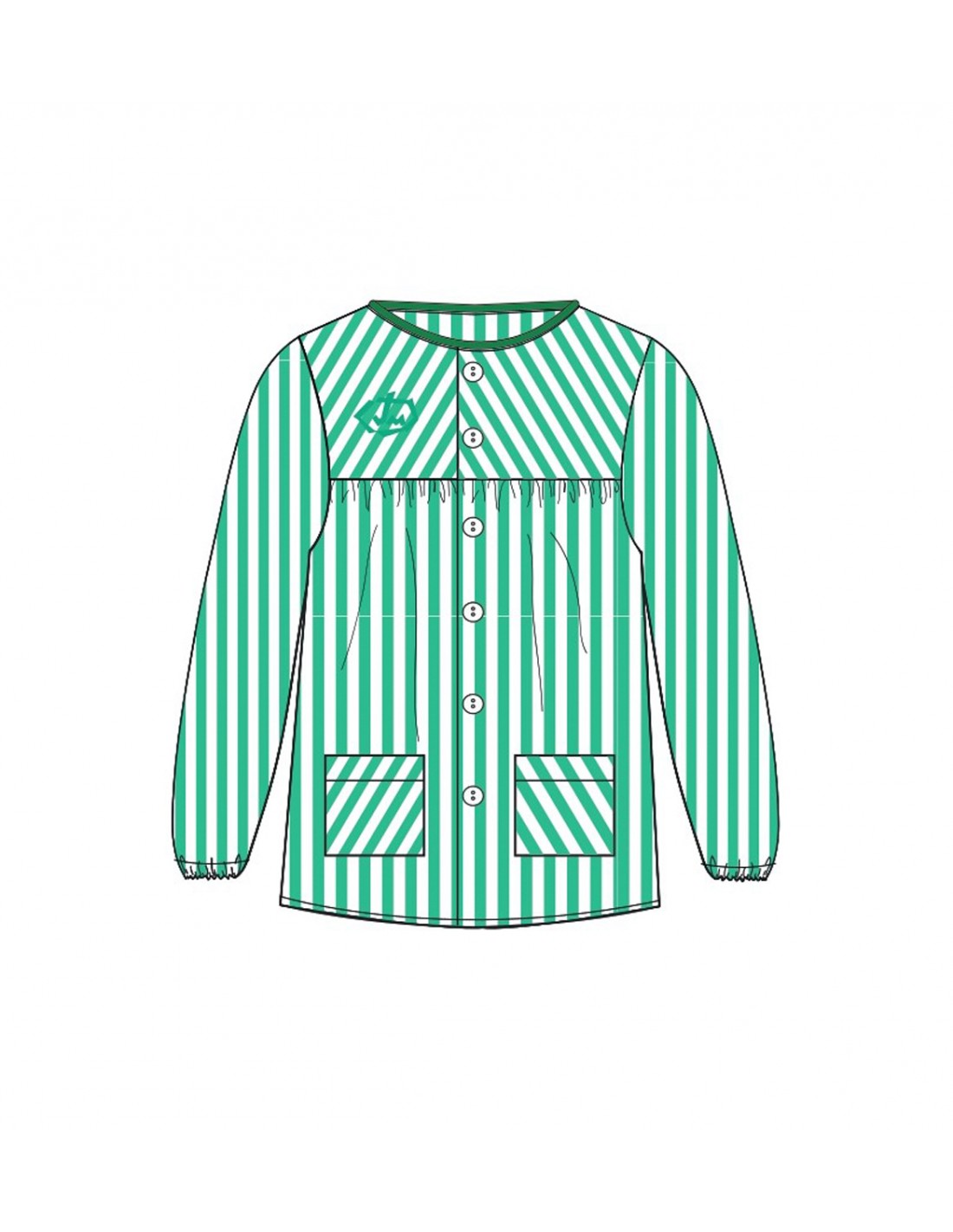 Solapa con botones blancos, dirección del tejido distinto del canesú y en los bolsillos. Vive verde en el cuello y puños acabados en goma elástica.